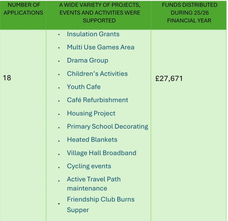 Firstly the community councils set up the Keir, Penpont and Tynron Joint Community Benefit Fund (JCBF) whose only task was to distribute these windfarm funds.